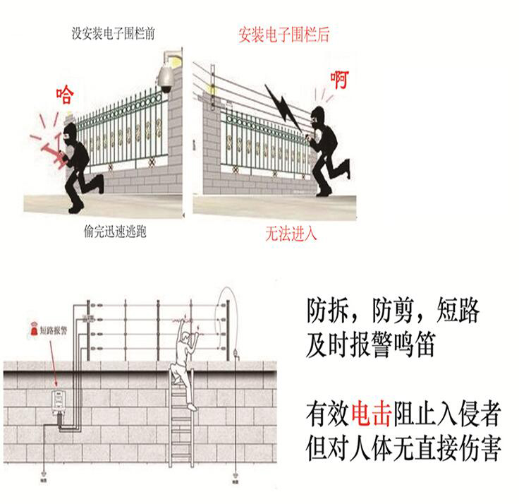 B。對(duì)執(zhí)意入侵者再給予脈沖電擊,促使其離開;數(shù)道電線組成的圍欄有效阻止人為翻越。